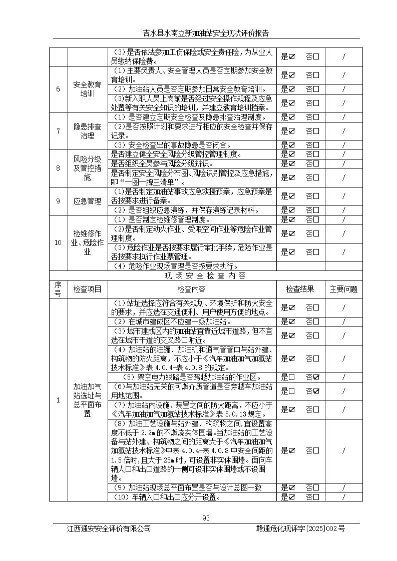 评价结论 | 吉水县水南立新加油站站址合理,周边环境良好,与敏感防护目标间距符合规范要求,站区建构筑物之间的防火间距、耐火等级符合标准要求,与总平面布置图一致,加油卸油工艺及设备设施合理,工艺布置得当,防雷设施经检测合格,采取的工艺安全设施符合规范要求;该加油站制定了安全管理制度和操作规程,人员经培训合格后上岗,安全管理人员经考核合格并取得安全合格证,主要负责人于2024年05月08日取得安全生产知识和管理能力考核合格证,能按照法律法规要求开展安全生产管理工作。 吉水县水南立新加油站符合《汽车加油加气加氢站技术标准》GB50156-2021等标准规范的要求,安全风险可控,满足危险化学品经营的安全条件。 | |||